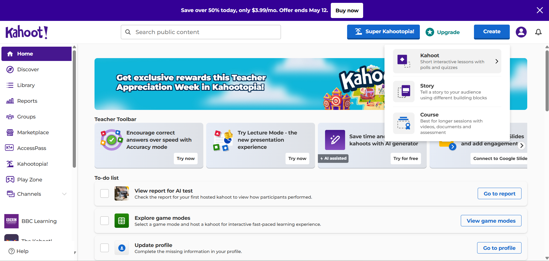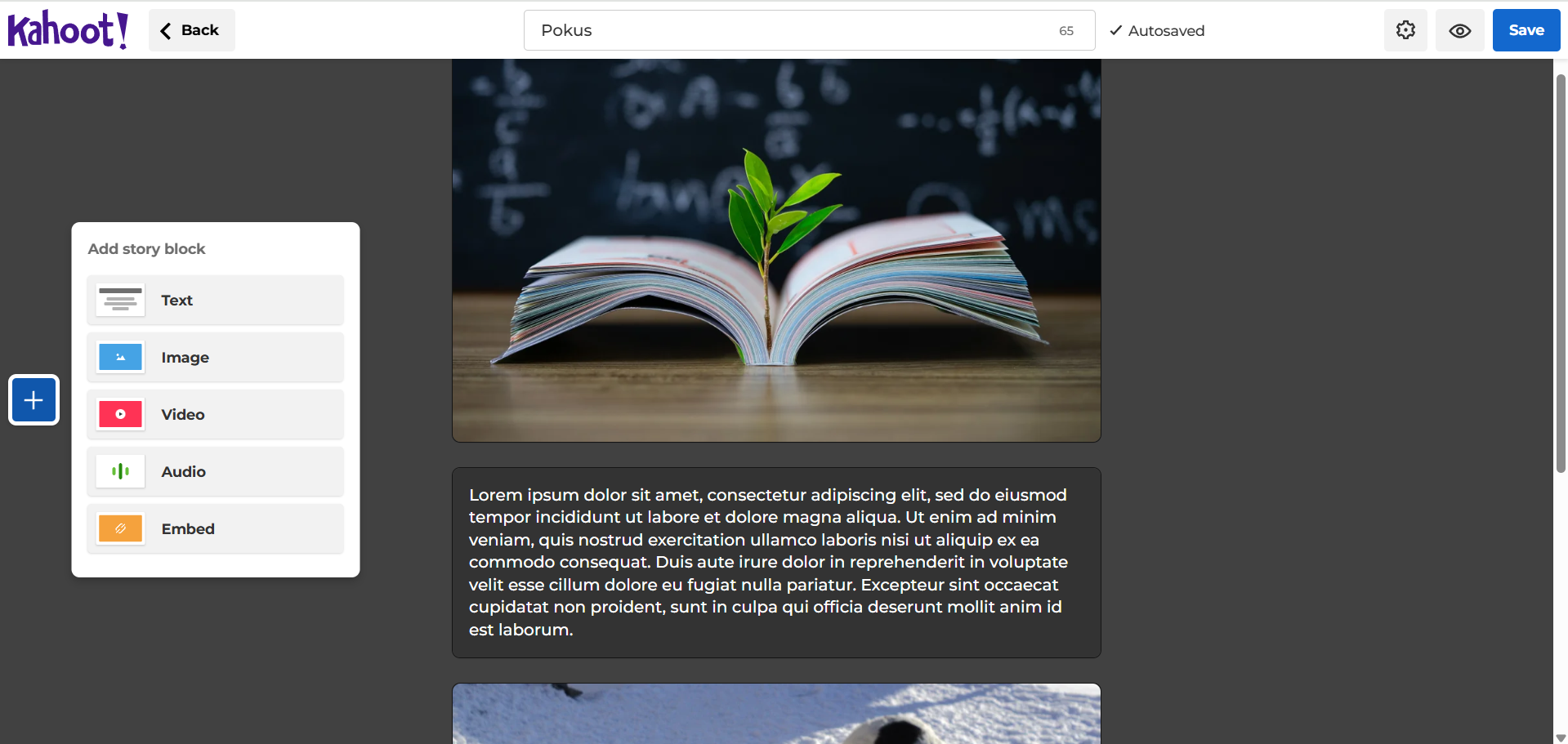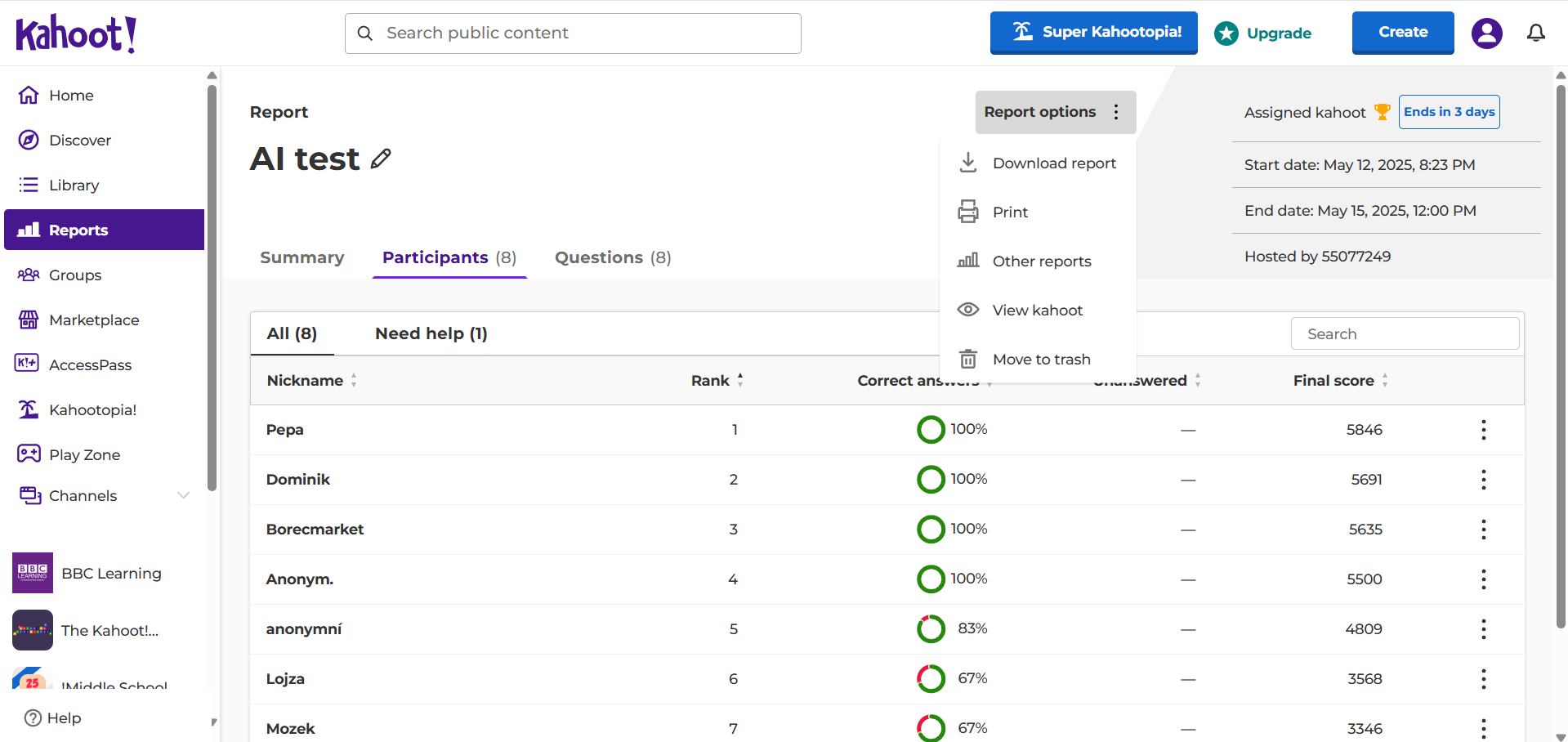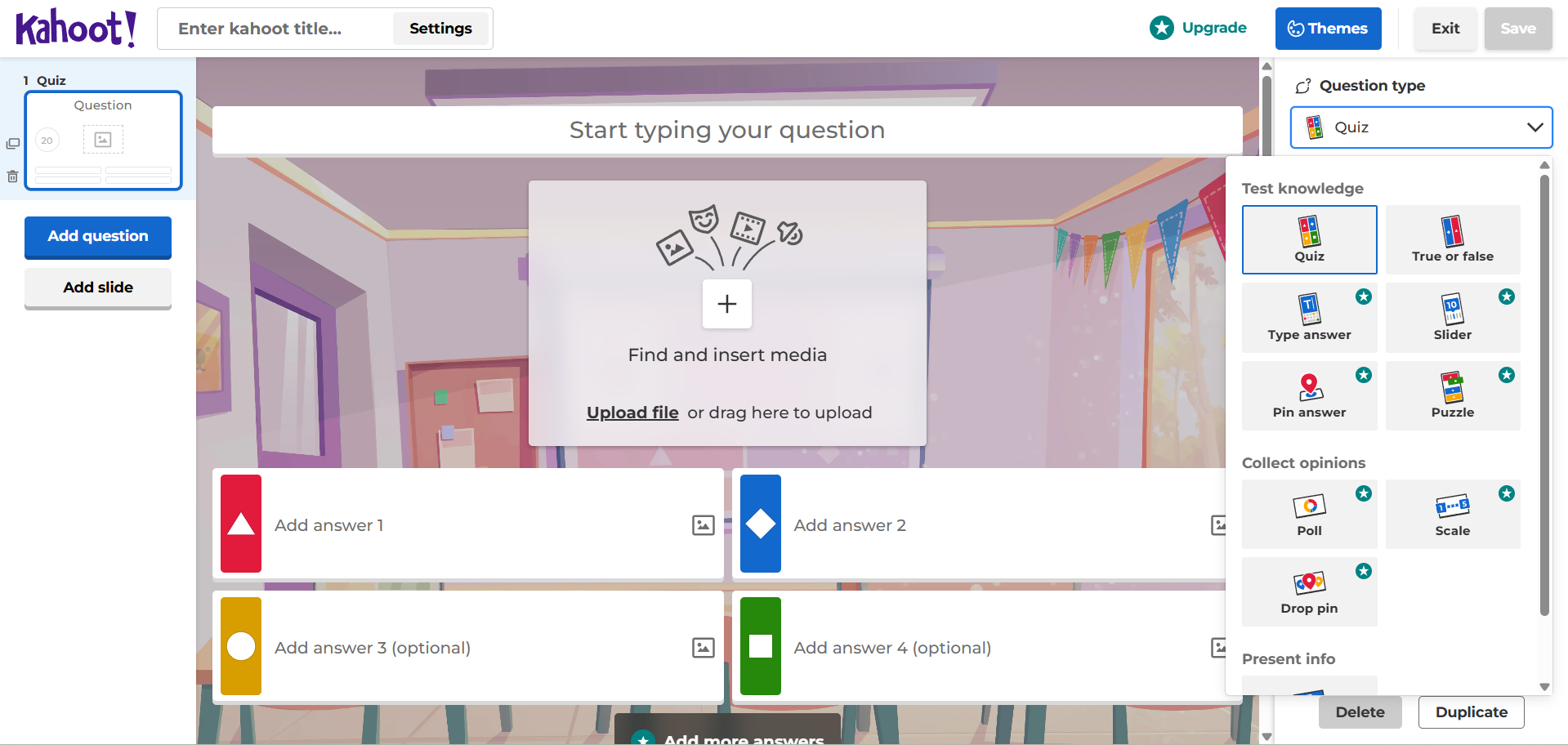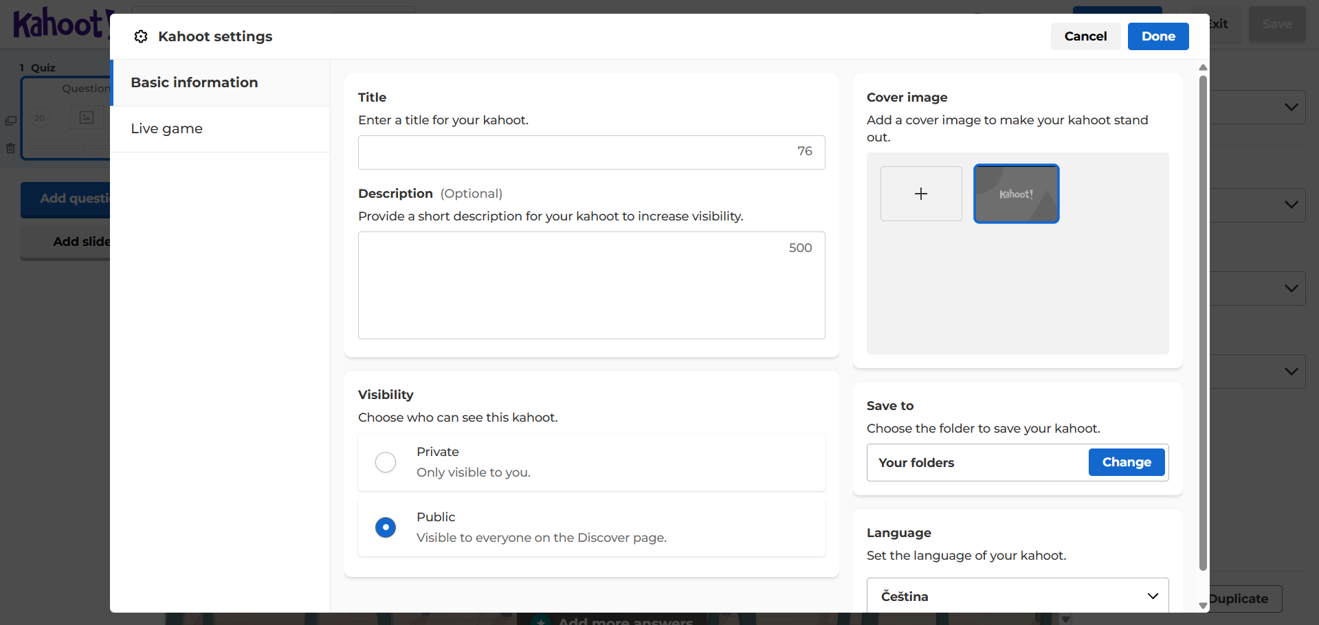 Kahoot! je online nástroj pro tvorbu interaktivních kvízů. Učitel vytvoří kvíz, studenti se připojí pomocí PINu a odpovídají na otázky v reálném čase. Otázky se zobrazují na sdílené obrazovce a žáci zapisují odpovědi na vlastních zařízeních (bez nutnosti instalace, nebo přihlašování). Systém průběžně aktualizuje skóre, čímž podporuje soutěživost a výsledky zobrazí ihned po skončení aktivity. Lze jej efektivně využít při opakování a testování znalostí. Nejčastěji se používá pro opakování látky nebo zábavné procvičování v reálném čase, ale lze jej využít i asynchronně pro domácí úkoly (Assign). Aplikace je vhodná pro opakování a shrnutí učiva, nebo krátké testy.