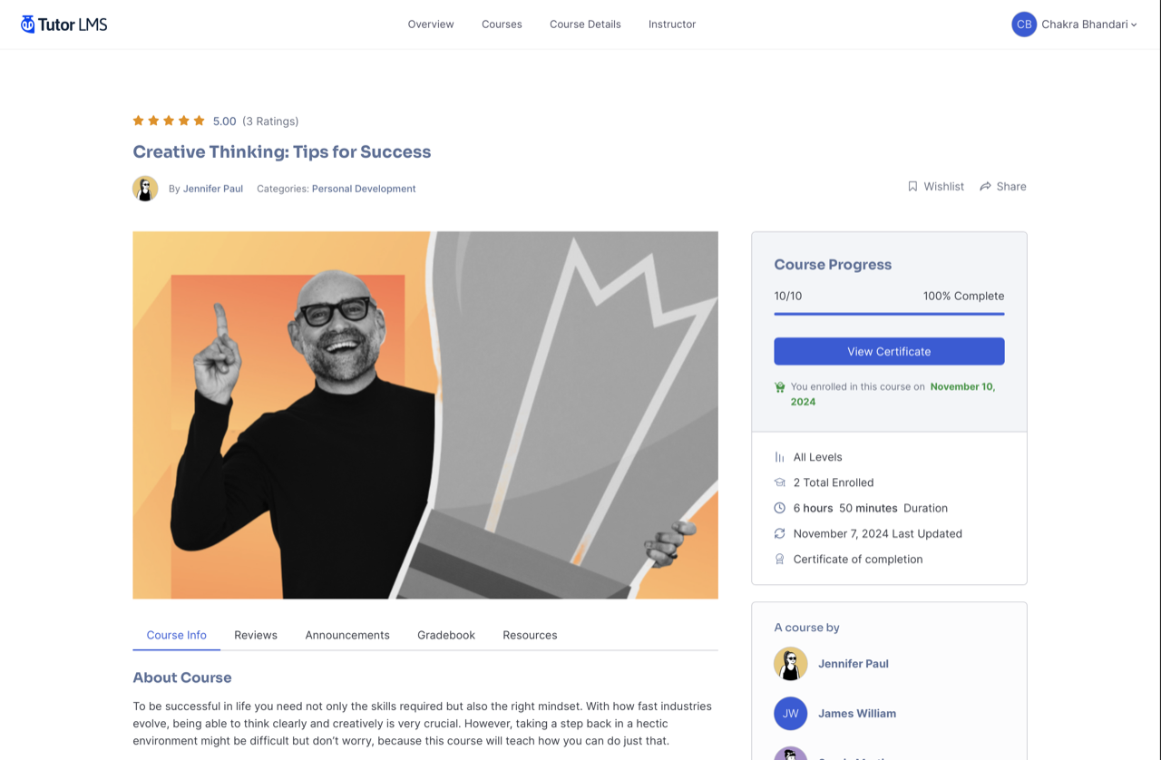Tutor LMS je WordPress plugin vytvořený firmou Themeum, který rozšiřuje redakční systém o funkce e‑learningu (kurzy, testy, certifikáty). Je známý pro přehledné rozhraní kurzů a integraci s WooCommerce (e-shopové řešení pro WP), díky níž lze prodávat kurzy přímo v rámci WordPressu. Plugin ve verzi Pro přidává funkce jako pokročilé typy otázek, detailnější statistiky a šablony certifikátů. SCORM / xAPI však není nativně podporováno a je nutné doinstalovávat další moduly, které podporu těchto standardů poskytují. Tutor LMS cílí hlavně na lektory a menší firmy, které chtějí rychle rozjet online školení ve známém WP prostředí. Licenční model je rozdělen na free základ a placenou Pro verzi s roční podporou a updaty.
